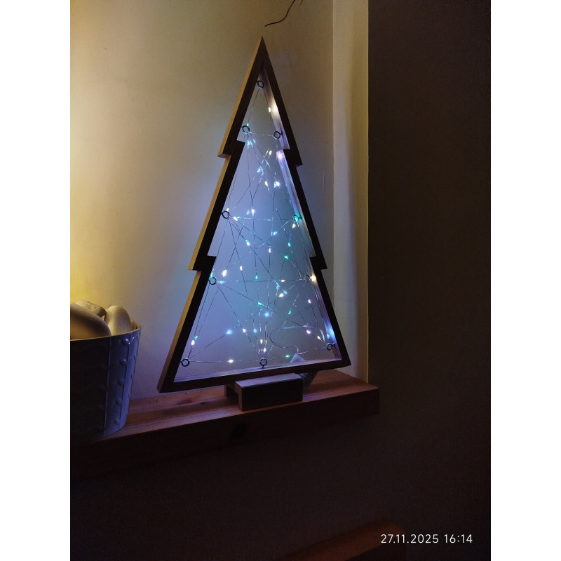 Stromek s osvětlením. Dřevo masiv dub. Povrchové úprava polomat. Rozměr cca 550x330mm. LED osvětlení "barevná". Baterie AA - 3x1,5V